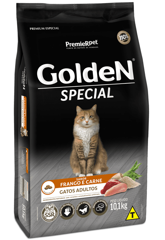 GoldeN® Special Gatos Adultos Sabor Frango e Carne é um alimento de alta qualidade, rico em vitaminas e minerais e garante maior saúde e vitalidade ao pet. Não tem adição de corantes e aromatizantes artificiais. Além disso, também possui uma seleção de ingredientes especiais que permite a redução do odor das fezes.
