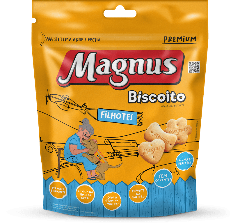 Magnus Biscoitos Cães Filhotes é um biscoito especifico para cães de todos os portes, elaborado com ingredientes especialmente selecionados que proporciona um sabor inigualável, além de auxiliar na limpeza bucal, Pode ser oferecido ao seu cão como demonstração de carinho, em momentos de diversão ou como recompensa em treinamentos.