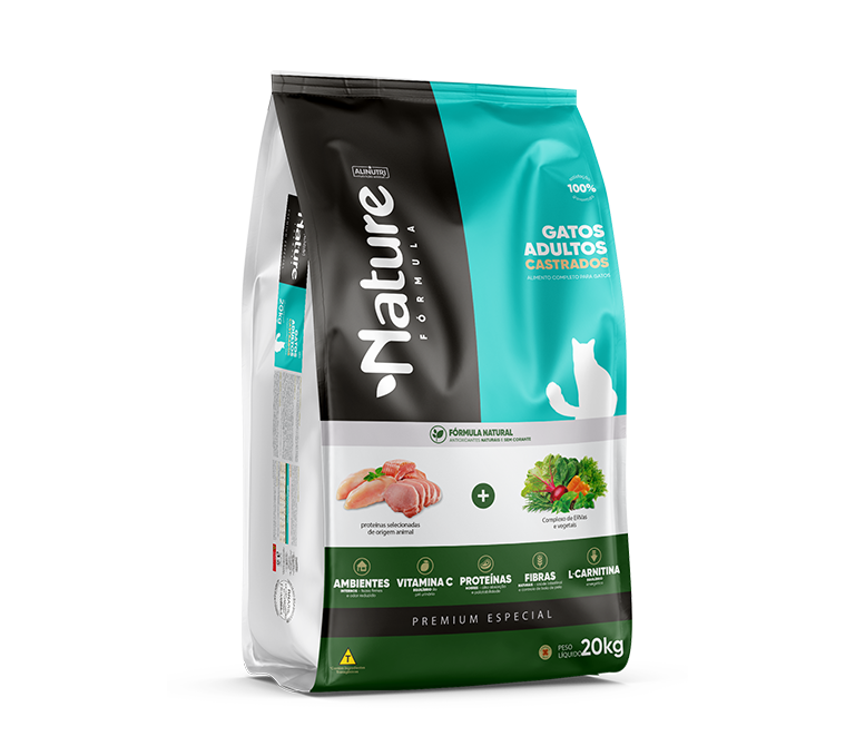 Alinutri Nature Fórmula Super Premium Gatos Adultos Castrados é indicado para alimentação de gatos adultos castrado de todas as raças. Preparações destinadas a fornecer ao animal a totalidade dos elementos nutritivos necessários para uma alimentação diária racional e equilibrada (alimentos compostos completos)