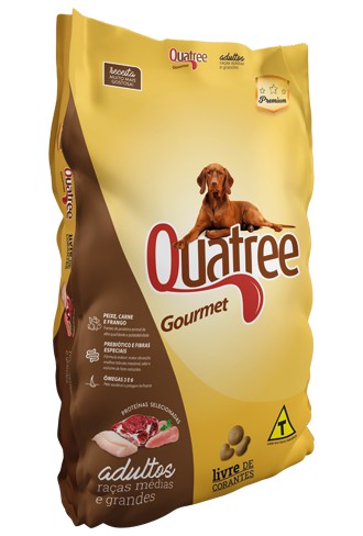 Quatree Gourmet é um alimento premium que concentra matérias-primas de alta qualidade para a alimentação balanceada de cães filhotes e adultos de pequeno, médio e grande porte. Em sua fórmula há vitaminas, minerais, ômegas 3 e 6, importantes fontes de proteínas, fibras e de energia. Um alimento delicioso, preparado para melhorar a saúde e aumentar a vitalidade dos nossos grandes amigos.