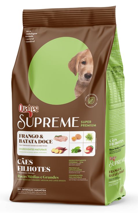 Quatree Supreme Filhotes Raças Médias e Grandes é um alimento Super Premium formulado com conservantes 100% naturais e livre de transgênicos, garantindo fácil digestão e absorção dos nutrientes. A combinação de proteínas selecionadas e ingredientes naturais e funcionais garante mais saúde e vitalidade para o seu cão. Indicado também para fêmeas a partir da sexta semana de gestação até o desmame total dos filhotes.